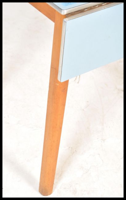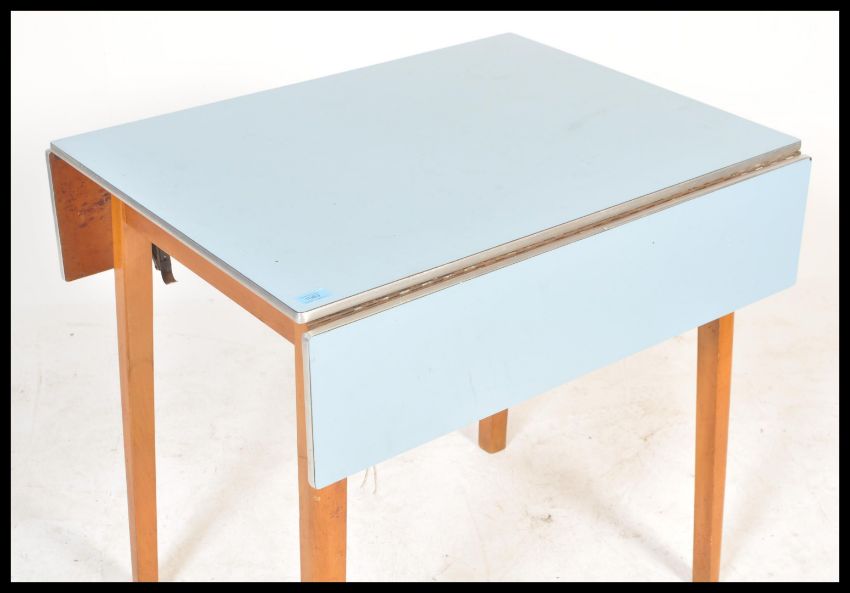 A vintage Retro 1950's / 1960's mid 20th century blue formica drop leaf Kitchen dining table, raised on beech tapering supports.