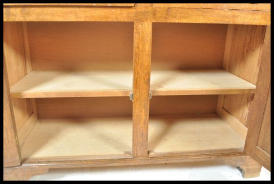 An early 20th Century oak dresser / bookcase cabinet raised two over two cupboard drawer base with large twin glazed door top complete with shelves. Brass swing handles to doors and drawers. Measures 252cm high x 117cm width x 47cm deep.