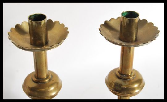 Three pairs of brass candlesticks dating from the 19th Century to include a pair with glass column uprights, a pair modeled as seated griffins.Tallest measures 22.5cm high x 11cm diameter.