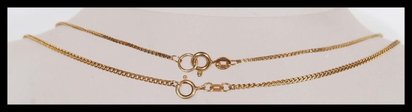 Two stamped 375 9ct gold necklace chains having spring ring clasps to include a box chain and a curb link chain. Total weight 5.4g. Longest measures 41 cm.