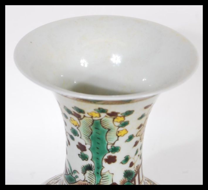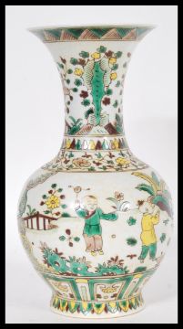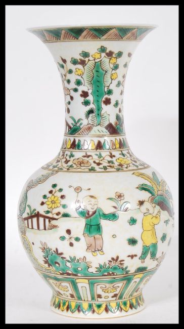 A 19th Century Chinese porcelain baluster vase having famille verte decoration depicting children playing and flowers. Six blue character marks to base. Measures 21cm high x 12cm diameter.