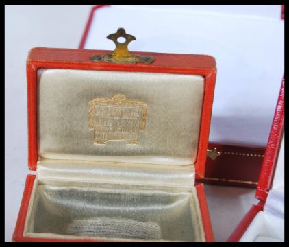 A collection of six red Cartier jewellery boxes to include two necklace boxes with gilt garland decoration, a pocket watch box, two ring boxes and square box. Largest measures 9cm high x 13.5cm width x 13.5 deep.