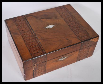 A 19th Century Victorian Tunbridge ware wooden sewing box having banded wooden inlay and mother of pearl inlay to the top, having a compartmentalised interior. 13cm high 30cm wide.