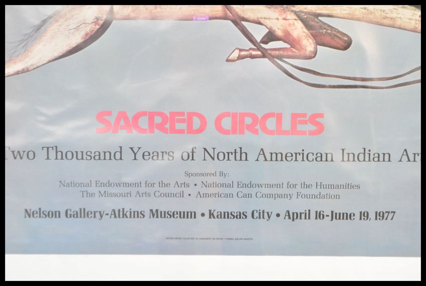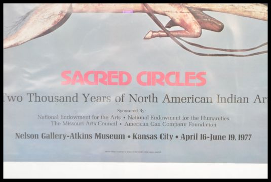 A framed and glazed promotional museum poster  for Sacred Circles Two thousand years of North American Indian Art 1977. Measures 72 cm x 101 cm.