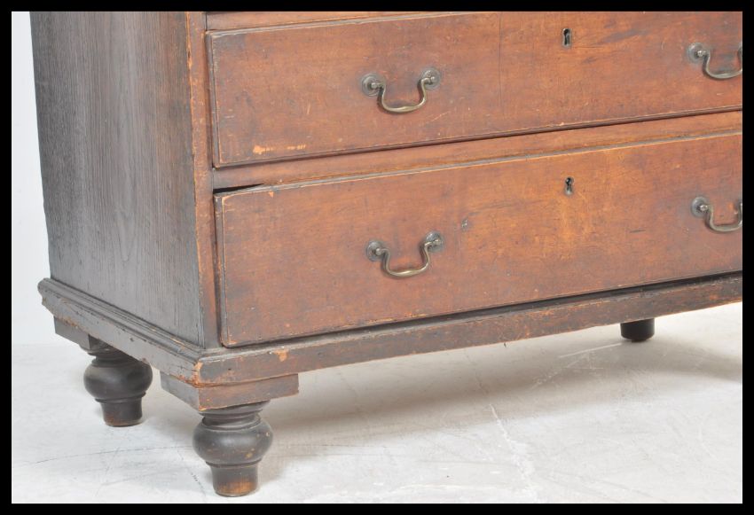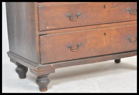 A 19th Century Georgian mahogany writing bureau, the fall flap enclosing a fitted interior of small drawers and pigeon holes and central cupboard over four long graduated drawers raised on turned supports. Measures 103 cm high x 88 cm wide x 50 cm deep.