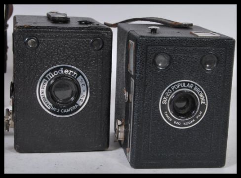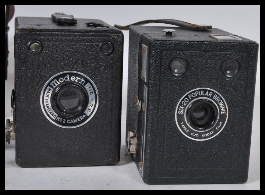 A pair of Hartzmann Wetzler 117 binoculars set within a brown leather case along with two box film cameras to include a Kodak box brownie and a Modern no.2 box camera.
