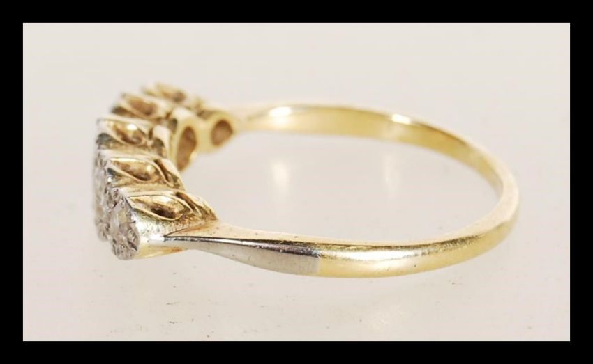An early 20th century stamped 18ct gold ring illusion set with five brilliant cut diamonds. Estimated approx 30pts of diamonds. Total weight 3.1g. Size N.5