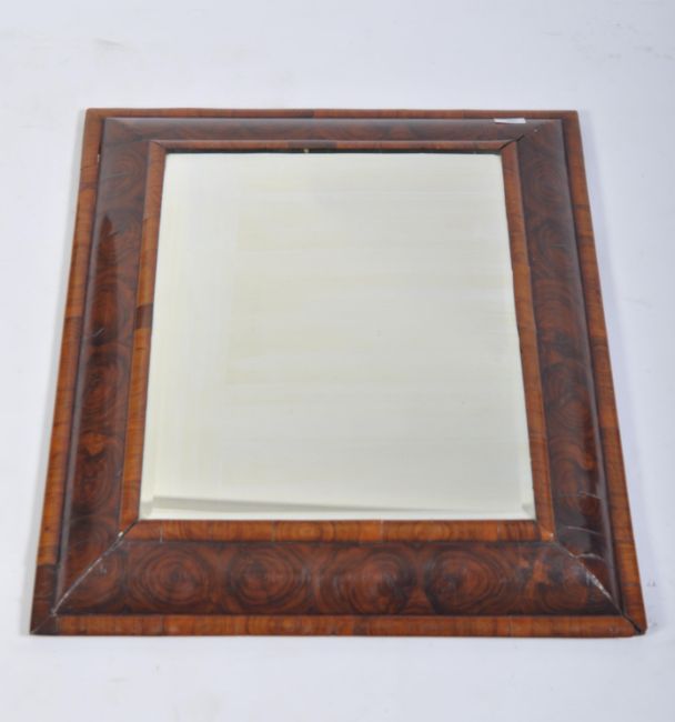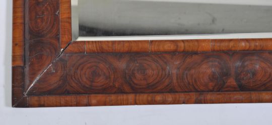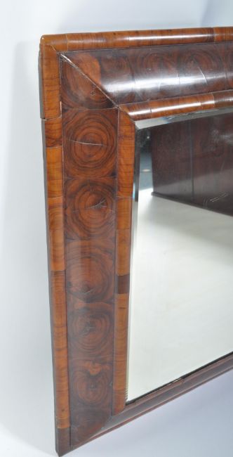 A believed 17th century Laburnum oyster veneer cushion mirror. The stunning rare Laburnum cushion shaped frame having a pronounced grain surrounding a later but old central panel mirror. Measures 73cm x 63cm