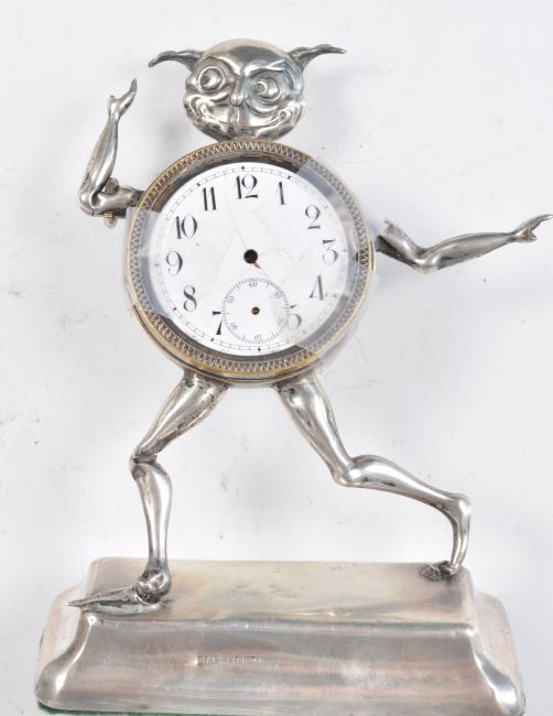 An early 20th Century hallmarked silver figural clock in the form of a comical character imp. Raised on shaped plinth base. (AF) Hallmarked for Birmingham believed date letter m for 1911 makers Marks & Cohen (Walter Henry Marks & Samuel Tobias Cohen). Measures 13cm tall.