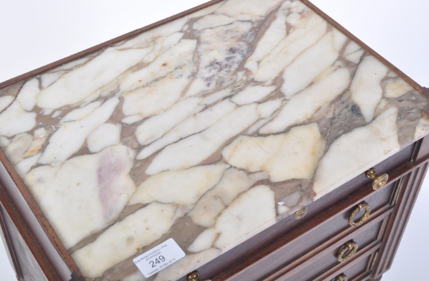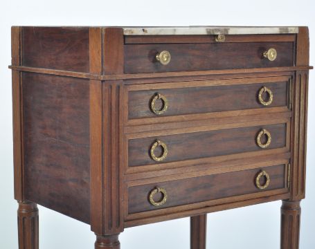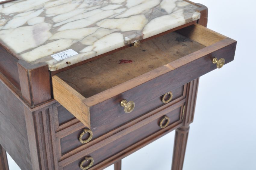A 19th century French Napoleon Empire mahogany and marble bedside table cupboard. Raised on reeded and turned legs supporting faux drawer fronted pot cupboard with marble lined interior having single drawer above. To the top a marble panel with gallery edge surround. Measures 78.5cm x 41cm x 30cm.