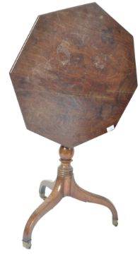 An 18th century George III mahogany tilt top wine / occasional table. Raised on splayed tripod leg base terminating in brass castors having turned column with octagonal table top above. Measures 99cms high ( up) x 67cms high ( down ) x 55cms diam