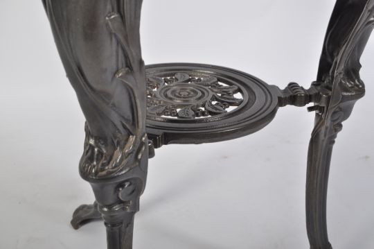 A rare antique Victorian early 20th century Boer War Commemorative cast iron ' Victory ' pub table. The cast iron base decorated with standing figures and scrolling motifs - each leg topped with a ' Victory ' shield. Rd No 375668 (1901). Mahogany top. Measures approx; 75cm high x 65cm diameter. Appears to have been fully restored - sandblasted and lacquered to a high standard, the table tops remaining original. Rare.