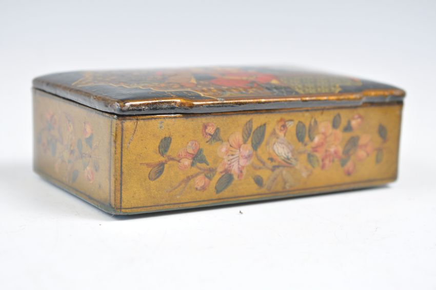 A 19th Century Qajar lacquer papier mache snuff box of rectangular form having hinged lid decorated with three gentleman. The sides decorated with birds amongst foliage. Measures 9cm wide.