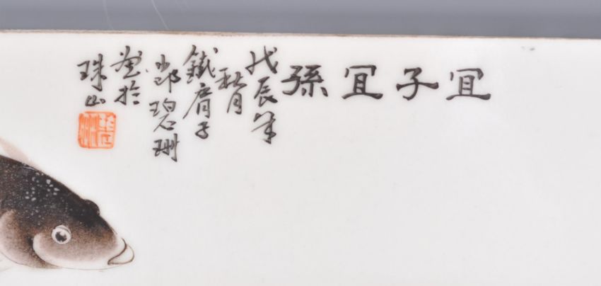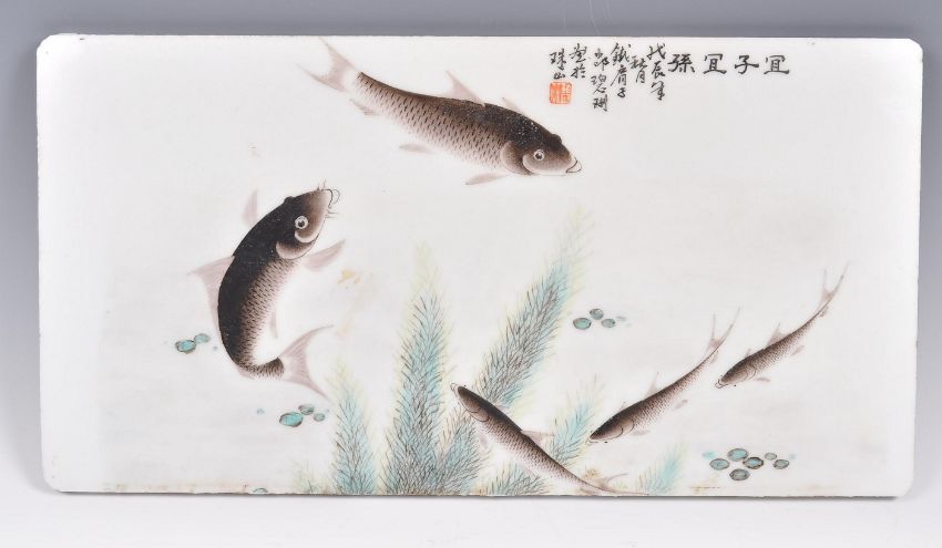 Deng Bishan (1874-1930) - A Chinese Republic period hand painted porcelain plaque depicting five fish among reeds with artist signature and monograms to front and dated 1928, Measures 18.5cm x 35.5cm.