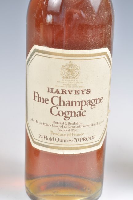 A bottle of Harveys Fine Champagne Cognac 70% proof  24 fluid oz. Believed to be 1904, seal on bottle no W1075