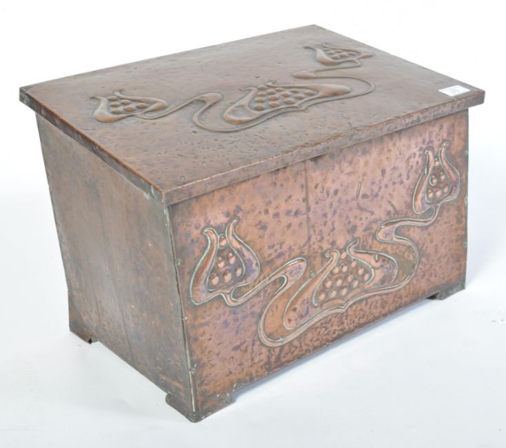 A Victorian 19th century Arts & Crafts Newlyn inspired copper embossed log bin. The pine carcass with panelled copper facia embossed tulips having a hinged top above. Measures 33cm x 47cm x 32cm