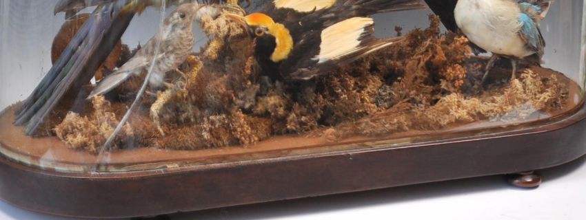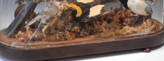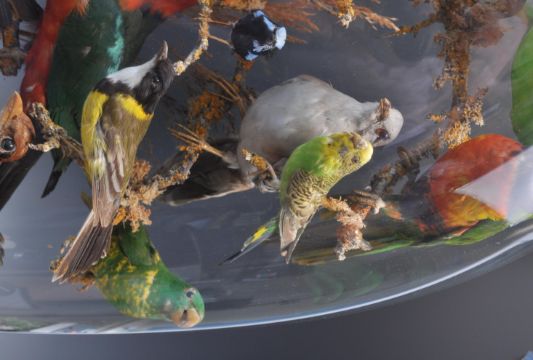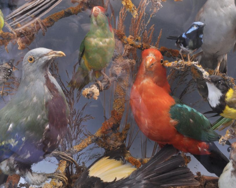 Taxidermy Interest - Birds of Australia - A fantastic 19th Century Victorian large diorama of exotic birds to include many tropical birds parrots, budgies, parakeets, kookaburra, crested pigeon, regent bower bird, honey eater, crow etc. Set to a naturalistic setting with foliage and branch. Neatly contained within a large glass dome and ebonised plinth base. Measures 69cm x 64cm x24cm.
