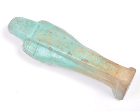 Ancient Egypt - An ancient egyptian ushabti faience mummiform funeral statuette having a light green colour, the figure depicted with clenched fists signifying the male, and hieroglyphics running down the centre of the figure, including the symbol for Osiris. Measures 11cm long. Please note the photographs of the letters are included as reference only and are not included in this lot. From the collection of Trevor James Brown who was given permission to enter the tombs in 1919. Trevor also wrote a manuscript on the theory of the Theobs.