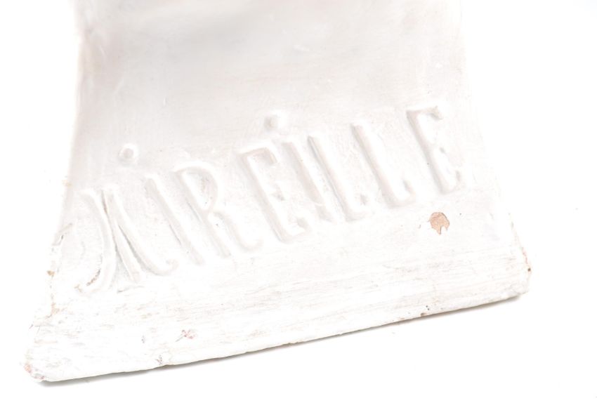 An early to mid 20th Century plaster bust of a lady believed original French shop haberdashery advertising piece. The bust of the maiden raised on pedestal base with Mireille notation to front. Measures 66cm high.