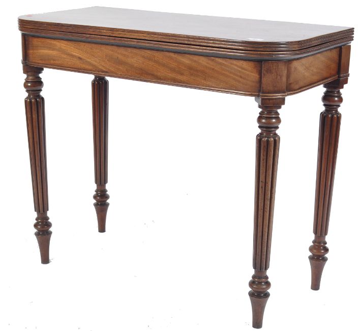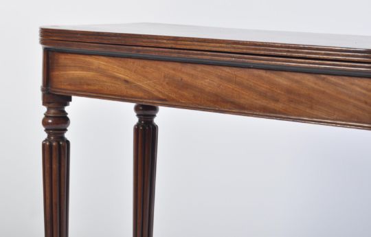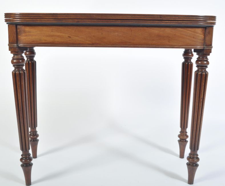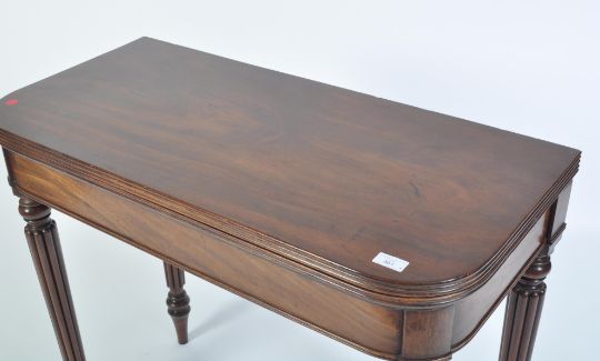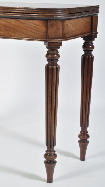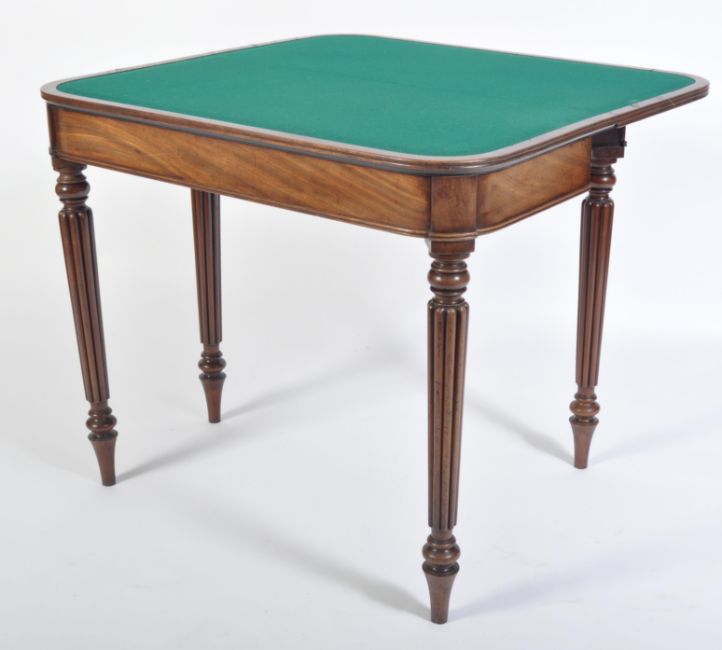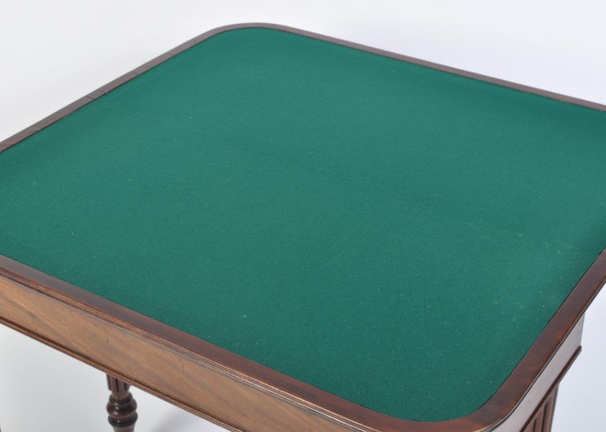 A  George III mahogany card / games table believed to be Gillows of Lancaster. Raised on turned and tapering spiral sugar twist legs with a fitted frieze above having fold over top with inlaid green baize lining. Measures 75 cm high x 88 cm wide x 42 cm deep.