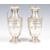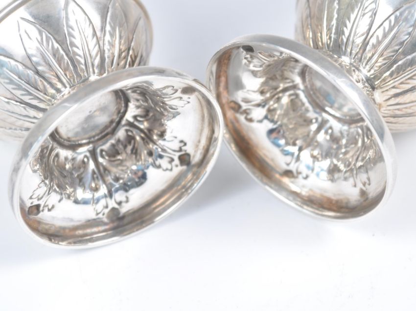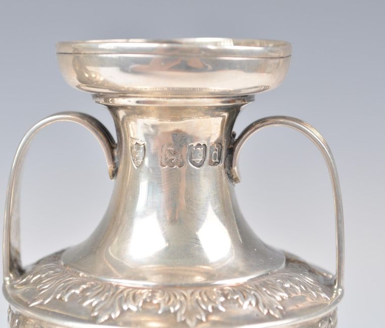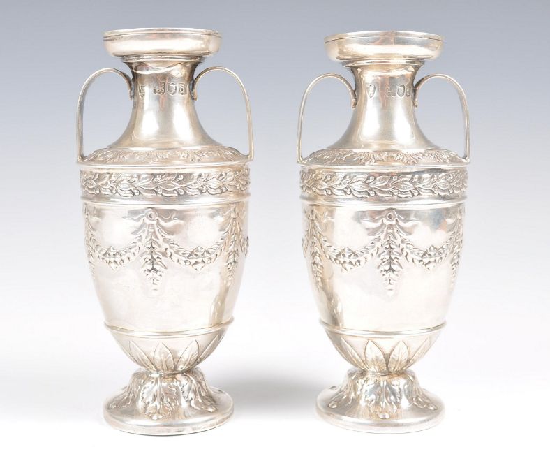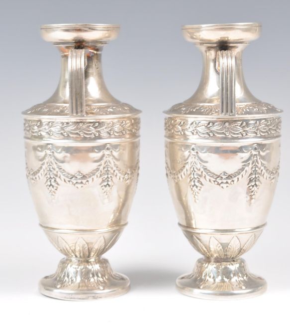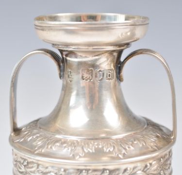 A pair of late 19th Century Victorian hallmarked silver vases of urn shape by R H Halford & Sons raised on circular bases decorated with oak leaves. Swag and ribbon decoration to the body with acanthus leaf borders. Twin shaped handle to the top with flared circular rim. Hallmarked for London 1899. Weighs 243.5 grams. Measures 14cm high.