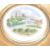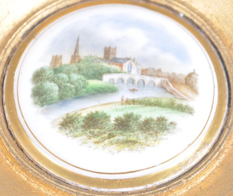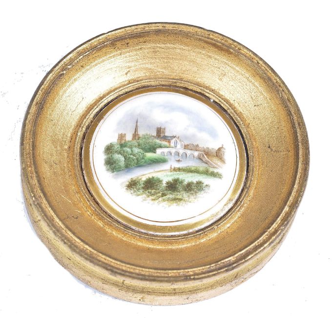 A 19th century Royal Worcester pot lid set within a gilt wood porthole frame. The pot lid with hand painted scene of town and bridge. Verso with puce coloured mark. Measures 11cms diameter