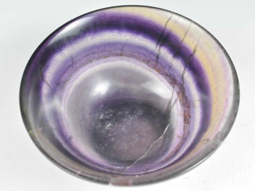 A rare 19th Century Victorian Derbyshire Blue John crystal stone bowl of conical form raised on simple circular foot with bands of purple, blue and yellow. Measures 6cm high by 14cm wide.