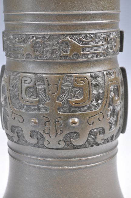 An early 20th Century Japanese bronze vase of Gu shape having flared trumpet rim. Nine Character marks to base. Inscribed to side Presented to Edwin Gumman and Co London 1910 with Compliments of Kyoshingumi of Kusatu and Kobe. Measures 33cm high.