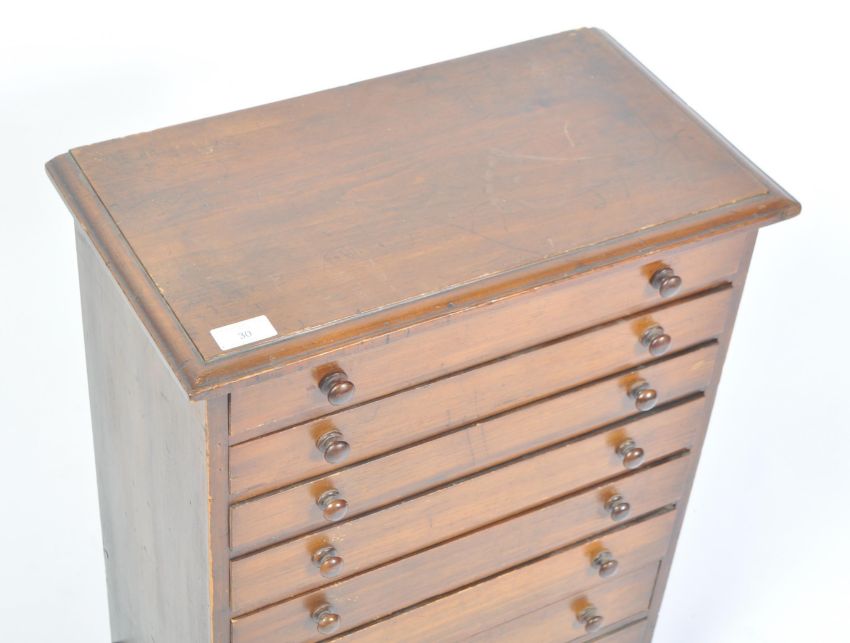 A Victorian 19th century 8 drawer mahogany specimen cabinet being raised on a plinth base with a bank / chest of 8 graduating drawers having flared top above. Measures 64cms high x 48cms wide x 27cms depth