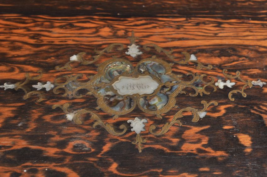 A 19th Century Victorian coromandel travelling case by Fisher 188 Strand. The top inlaid with a strapwork motif in brass, mother of pearl and abalone opening to reveal a fitted interior with a series of glass bottles and other items with plated fittings. Lift out tray over a plain void with a push button revealing a fitted jewellery tray to the base. Complete with brass Bramah lock. 17cm high x 30cm wide x 23cm deep.