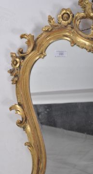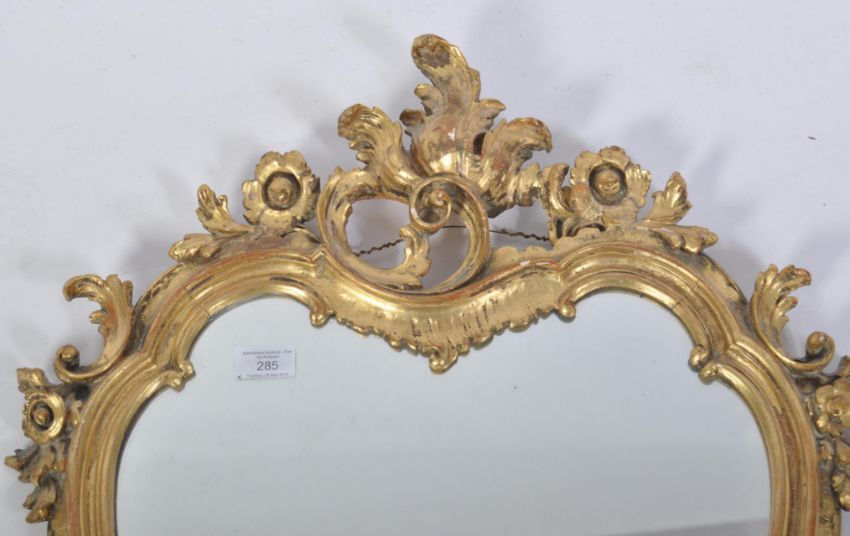 An 18th century giltwood cartouche wall mirror, The gilded wooden frame being heavily detailed with rococo workings surrounding the central mirror glass.  Measures 77cms high x 53cms wide