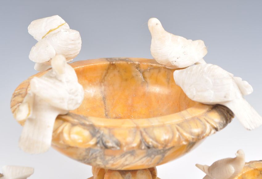 A 19th Century Italian Grand Tour set of three marble alabaster bird baths mounted with white marble bird figurines. Comprises of a two piece larger example raised on stepped square base with bulbous knopped column and shaped bowl atop. The matching smaller pair of similar form raised on single square bases. Larger example measures 15cm high and 22cm diameter excluding birds.