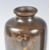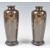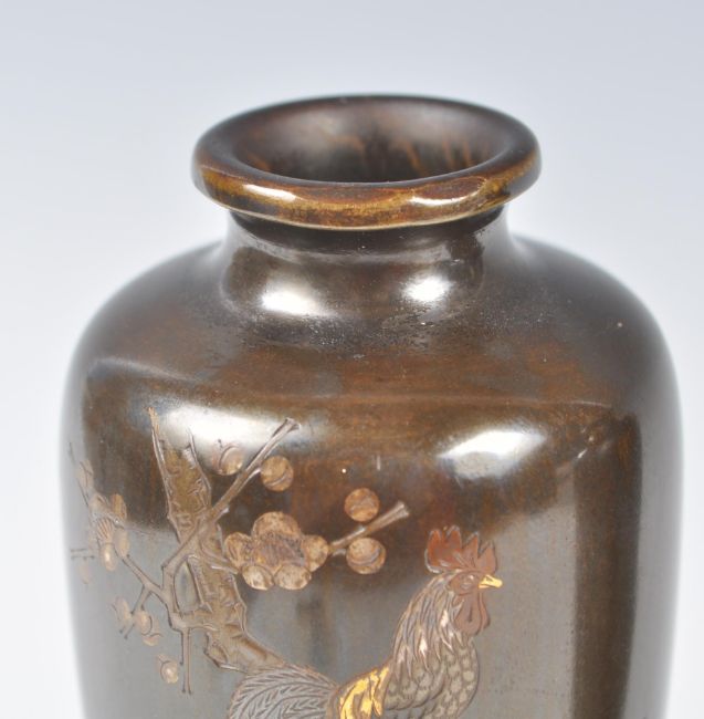 A pair of 19th Century Japanese Meiji Period (1868-1912) bronze vases having mixed metal silver inlay decoration depicting two cockerels perched on blossoming prunus branches. Signed by artist. Raised on socle wooden bases. Measures 14cm long.