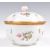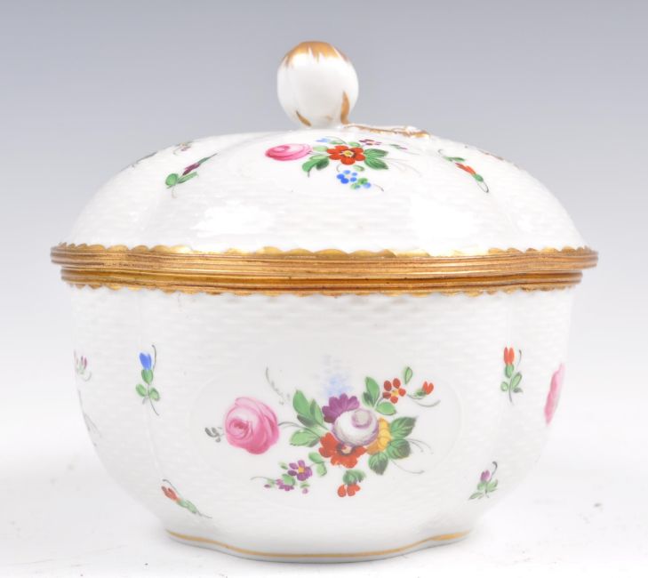 An early 19th Century Georgian believed Swansea porcelain lidded pot of loped form having a basket weave ground with white enamel panels depicting hand painted floral sprays. Hinged lid opening to reveal similarly decorated interior with gilt brass mounts. Gilt anchor mark to base. Measures 11cm high.