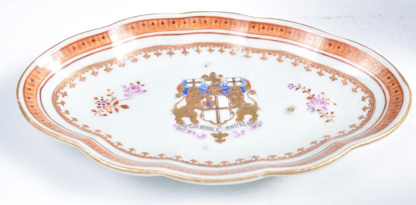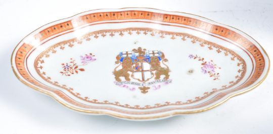 A pair of 19th century Samson armorial crested gravy boats. Each boat with coat of arms to one side, floral sprays to the other having geometric patterns to each stand. Measures 13cms high x 18cms wide