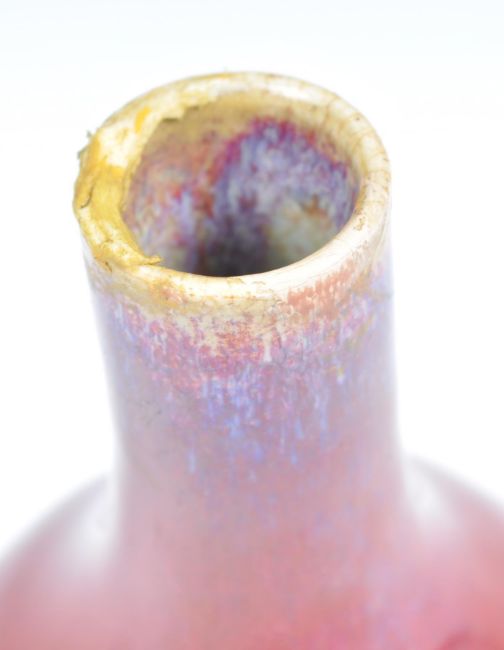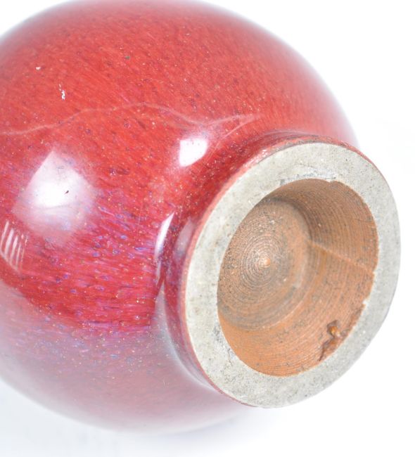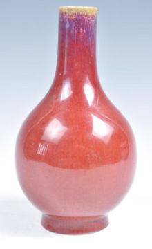 A 19th Century Chinese pottery monochrome bottle vase of baluster shape having a simple red ground the bulbous body leading to fine waisted cylindrical neck and rim. Raised on a small circular foot. Measures 15cm high.
