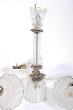 A 19th century sugar twist cut glass 3 branch electrolier - chandelier. The s-scroll arms reaching out to the shades. All linked to an upright sugar twist glass column with rose atop. Measures 52cms high x 60cms diameter