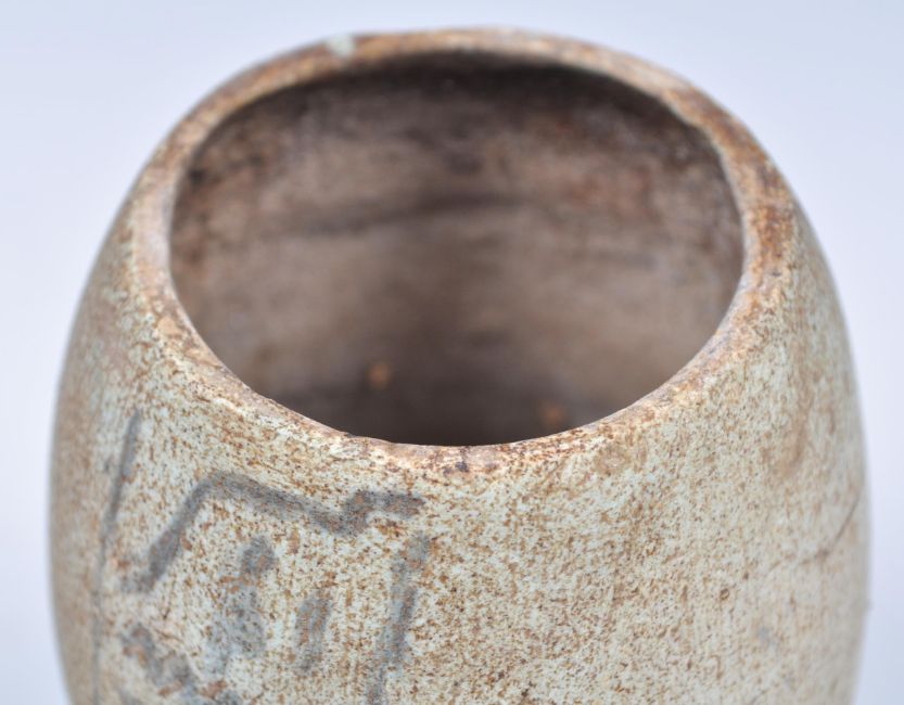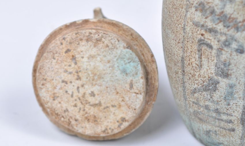 An Ancient Egyptian faience hollow canopic jar having blue colouration with black hieroglyphics, the jar names Duamutef, the jackal headed son of Horus and protector of the stomach, with the jar lid being in the form of Qebehsenuef, the falcon headed protector of the intestines. Measures 15cms Please note the photographs of the letters are included as reference only and are not included in this lot. From the collection of Trevor James Brown who was given permission to enter the tombs in 1919. Trevor also wrote a manuscript on the theory of the Theobs.