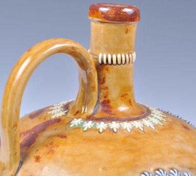 A 19th century Doulton Lambeth stoneware glazed ewer jug. Mustard glaze with embellished banding having two large cartouche panels, one depicting a farmer woman and sow, the other a floral roundel. Waisted neck with loop handle. Impressed marks and RD no 4817 for 1884 - 1885 with further marks and initials BP to base. Measures 23cm high.