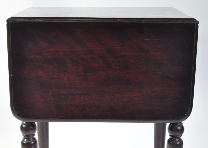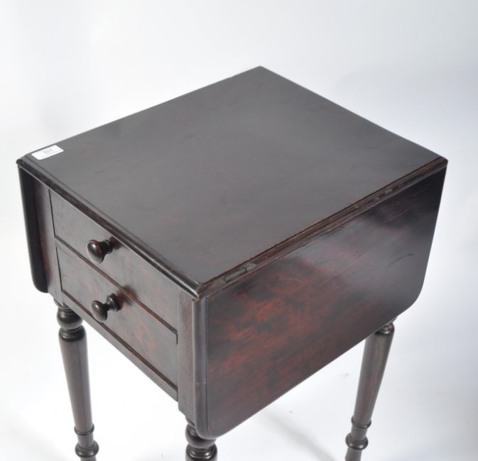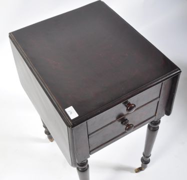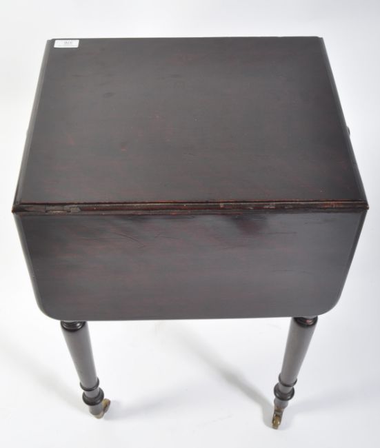 A 19th century Regency / George III  ladies mahogany small pembroke table bearing retailers label for Heals of London. Raised on turned legs terminating in brass castors, the table with drop leaves either side of the faux front / fall down locker door. Knob handles and faux drawer fascia. Measures 72cm x 38cm x 45cm.