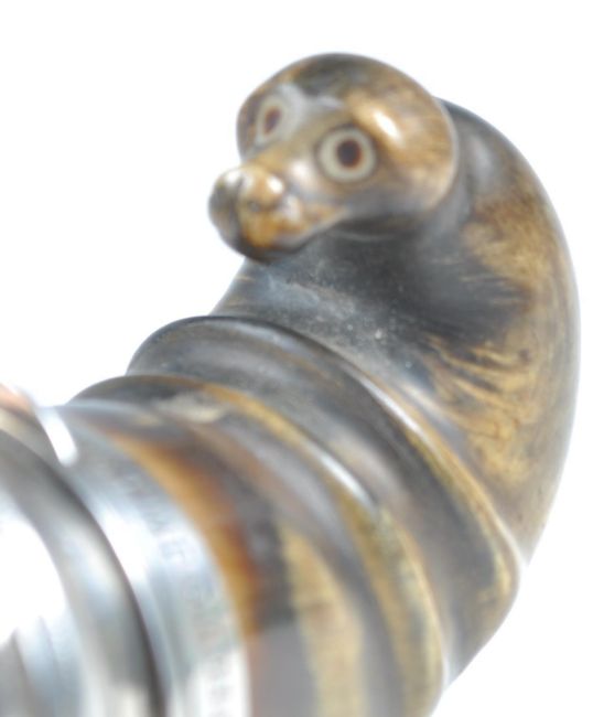 A 19th Century Victorian Scottish silver and horn snuff mull or mill having a carved figural walrus and citrine / glass faceted cabochon to lid. Measures 8cm long.