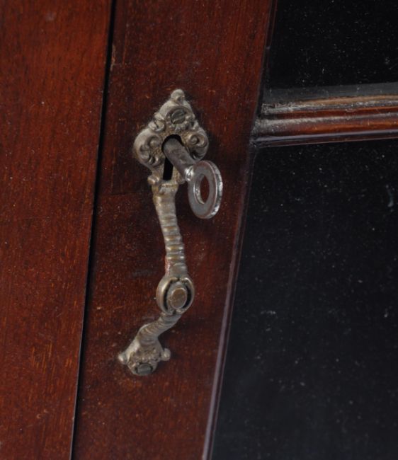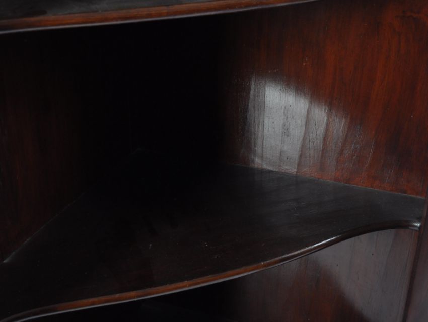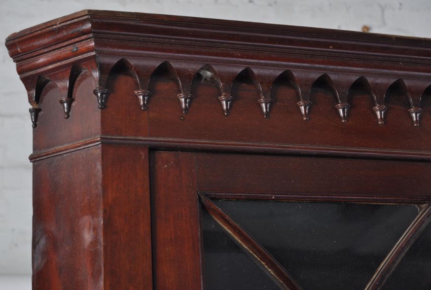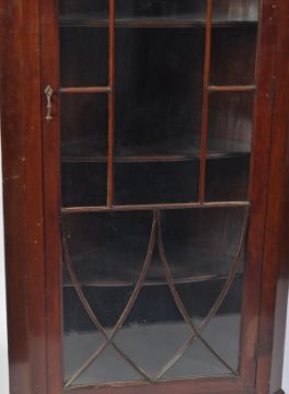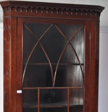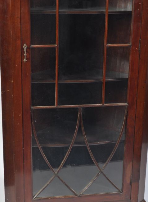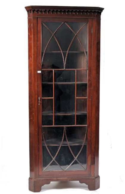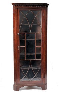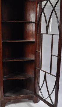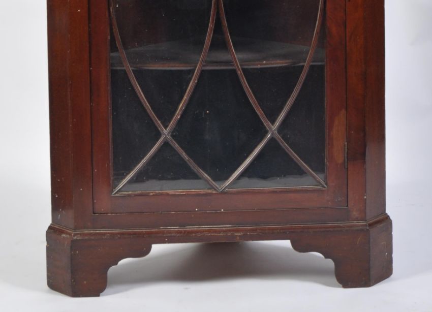 A 19th century George III rare full size mahogany astragal glazed bookcase corner cabinet. The tall cabinet being raised on bracket feet with full length single astragal glazed door housing shelving set within. Flared pediment above, original back boards in place. Measures 215cm high by 90cm.