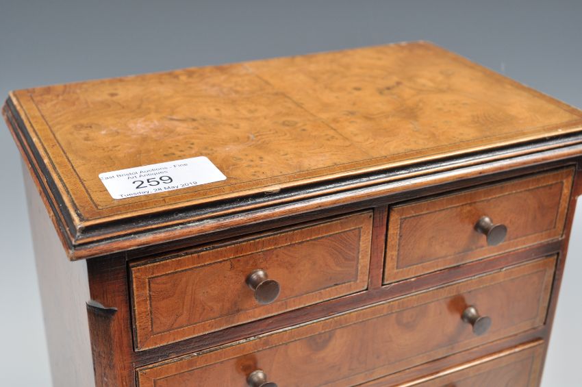 A Queen Anne style apprentice piece walnut and crossbanded chest on chest of drawers / tallboy together with a matching chest of drawers. Each raised on bracket  feet with knob handles to the drawers, flared tops with cross banded tops to front and sides, canted corners to each. Chest measures 24cms x 22cms x 13cms  & tallboy 40cms x 21cms x 12cms