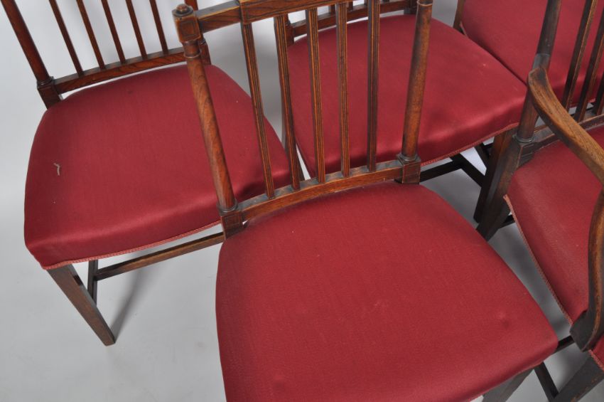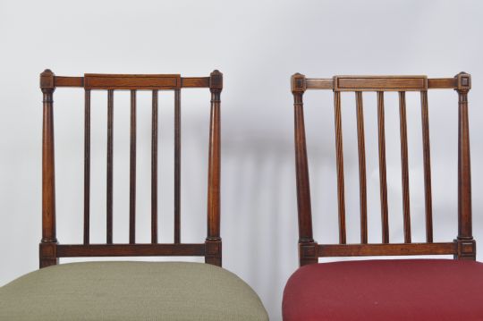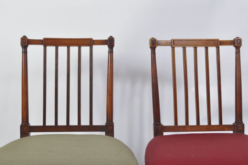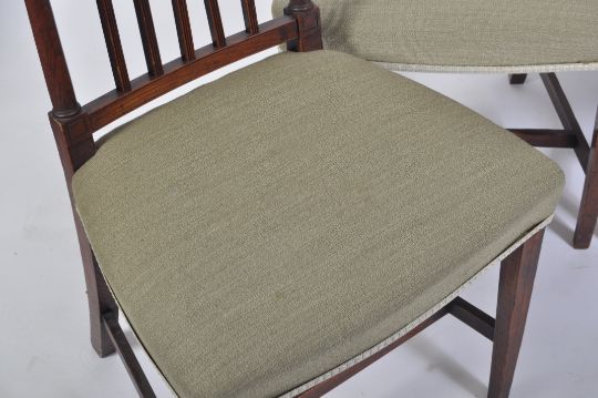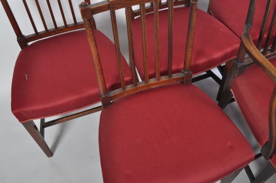 A good set of 12 19th century oak and elm George III dining chairs. Raised on square tapering legs united by stretchers with overstuffed seats having turned gallery back rests with shaped top rails above.  The set comprising 8 chairs including carvers together with another 4 chairs to include 1 carvers but in green upholstery. The back of the green upholstered carver very slightly different to the upright rails having fleur de lys detailing at top. Measures 88cms high x 53cms wide x 44cms depth x 45cms height to seat
