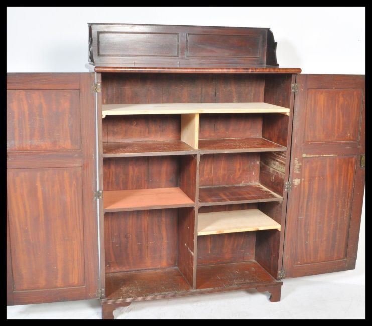 An early 19th Century flame mahogany bookcase cabinet having scrolled gallery top with brass lined door. Knob handle to front of door that opens to reveal a fitted interior with shelves. Measures: 147cm high x 102cm wide x 39cm deep.