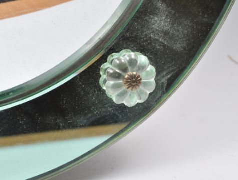 An early 20th Century Art Deco glass wall mirror of circular form having a central convex mirror with two colour bevelled glass frame with glass rosette prunts. Measures 41cm wide.