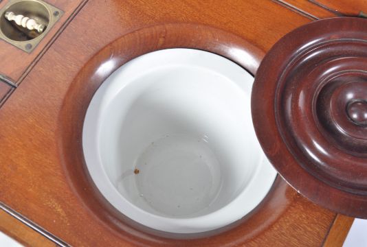 A 19th century Victorian mahogany campaign box commode  having a hinged top opening to reveal a ceramic liner with brass flush and hinged side locker.  Measures 48cms high x 61cms wide x 53cms depth