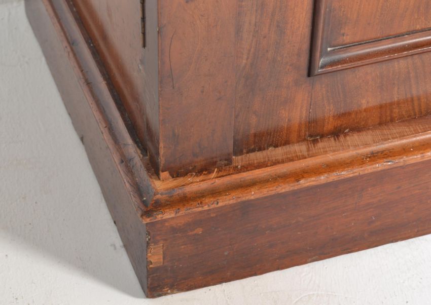 A mid Victorian 19th century Scottish mahogany triple wardrobe compactum linen press. Raised on a plinth base with a double section linen press over chest of drawers being flanked by an upright sentry box wardrobe. Flared simple form cornice above set over embellished upper corners. Dismantles for ease of movement. Measures 199cms high x 188cms wide x 58cms depth