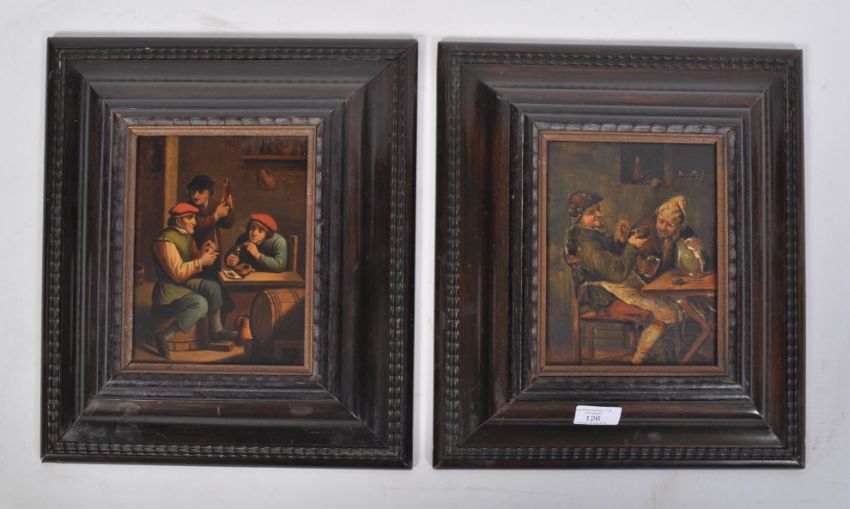 After David Teniers ( 1610 - 1690 ) A pair of 19th century oil on copper panel paintings - tavern drinking house scenes being set within Dutch wooden cushion frames of the period. Measures 33cms x 38cms frame
