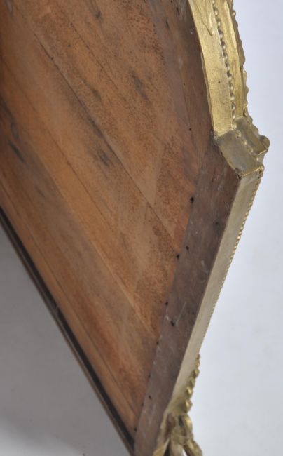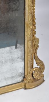 A large 19th Century giltwood and gesso plaster ribbon worked overmantel mirror. The large cushion framed mirror with shaped edges and detailing having central plate mirror glass beneath stunning wire plaster worked gilded ribbon crest. Measures 121cms high x 137cms wide